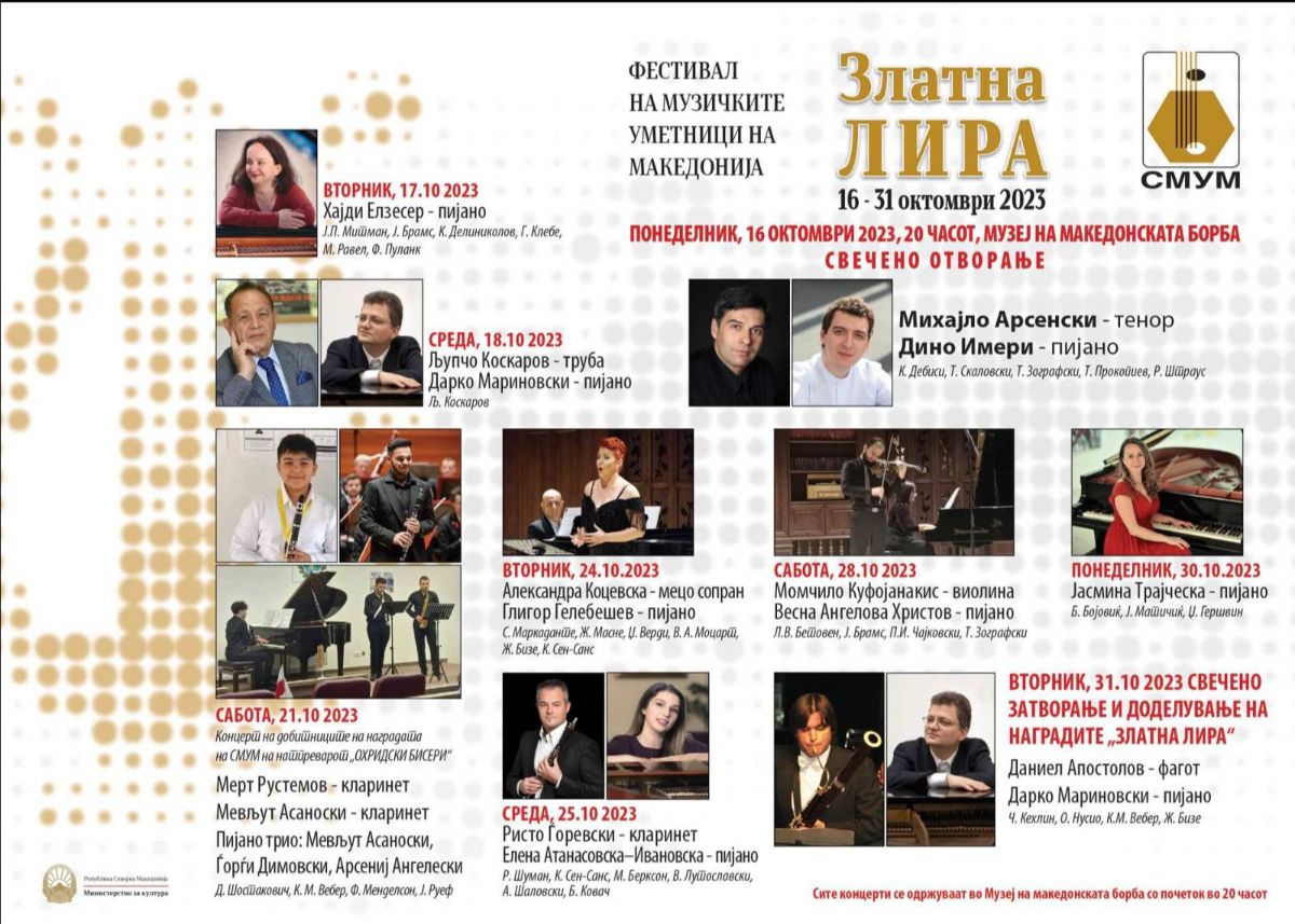 Во сабота, 22 октомври, во Музеј на македонската борба во 20 часот ќе се одржи концерт на пијанистот Арсениј Ангелески, добитник на наградата на СМУМ на натпреварот „Охридски бисери“, во рамки на Фестивалот „Златна лира“. Фестивалот „Златна лира“ традиционално секоја година својот концертен подиум го отстапува на младите музички надежи кои со својот талент, елен и посветеност кон изучувањето и изведбата на музичката уметност придонесуваат кон неопходниот развој и растеж на музичката сцена во нашата држава. Дополнително, СМУМ преку своите редовни активности уште повеќе ги мотивира и поттикнува младите музичари да работат на надградување на своите знаења и вештини во изведбата на музичката уметност. Таква е и наградата која СМУМ ја доделува за најдобар музичар во рамките на годишниот натпревар „Охридски бисери“, која годинава му беше доделена на младиот талентиран пијанист, ученик во средното музичко училиште во Битола, Арсениј Ангелески. Оваа вечер, талентираниот млад пијанист ќе изведе рецитал со дела од Бетовен, Шопен, Лист и Скрјабин. Арсениј Ангелески е роден во 2005 година во Прилеп каде го завршува нижото музичко образование во ООМУ „Ордан Михајлоски - Оцка“ (класа на Христина Никоска - Тасеска). Денес е ученик во трета година во Државното средно музичко училиште во Битола, во класата на проф. Татјана Божиновска. Во својата досегашна едукација е добитник на повеќе од триесетина специјални и први награди на државни и меѓународни музички натпревари во нашата земја и надвор од нејзините граници (Србија, Бугарија, Босна и Херцеговина, Швајцарија, Хрватска). Во 2022 настапи како солист со оркестарот на Државното музичко училиште во Битола, по повод 75 годишнината од формирањето на ДМУ Битола. Ангелески учествувал на повеќе семинари по пијано кај истакнати пијанисти и педагози, меѓу кои : Ана Гацева, Карл Андреас Коли (Швајцарија), Рустан Рахмедов (Турција), Катарина Крпан (Хрватска), Дино Имери. Во 2015 година учествуваше на летниот музички семинар во Врање, Србија под менторство на проф. Зоран Имшировиќ (Унгарија), Масако Сакаи (Јапонија). Во 2022 учествуваше на семинарот во Грожњан, Хрватска, под раководство на Катарина Крпан (Хрватска), Владимир Крпан (Хрватска), Драгомир Братиќ (Србија) и Даниел Ото (Хрватска). Влезот на концертот е слободен.